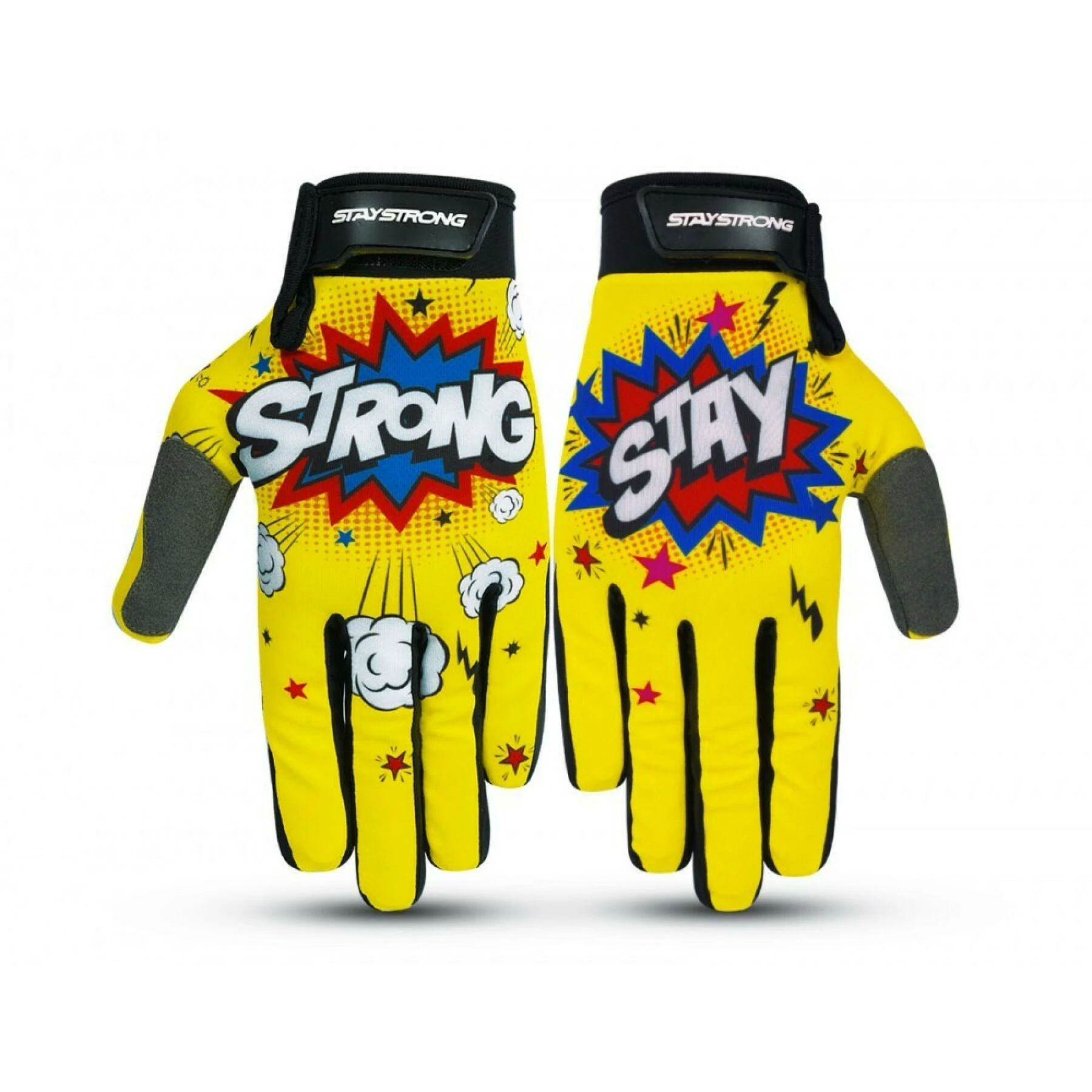 Les gants Stay Strong POW propose une coupe slim confortable.Les gants POW présentent une paume en Clarino très résistante. Ce textile apporte une protection maximale contre l’abrasion, une durabilité accrue et une bonne ventilation. La paume et l’index et le majeur sont équipés de patchs en silicone qui offre un grip optimal sur le guidon. La fermeture du gant s’effectue via une bande velcro.Le pouce bénéficie d’une construction renforcée avec un patch en Clarino.EN DÉTAIL :Paume en Clarino, ce textile souple, résistant contre l’abrasion et respirant offre une texture type « daim » avec un touché doux.Le dessus du gant est en Lycra souple apporte confort et une coupe ajustée.Patch en silicone imprimé sur la paume, l’index et le majeur.La fermeture du gant s’effectue via un velcro, pour une coupe ajustée au maximum.Lavable en machine à laver