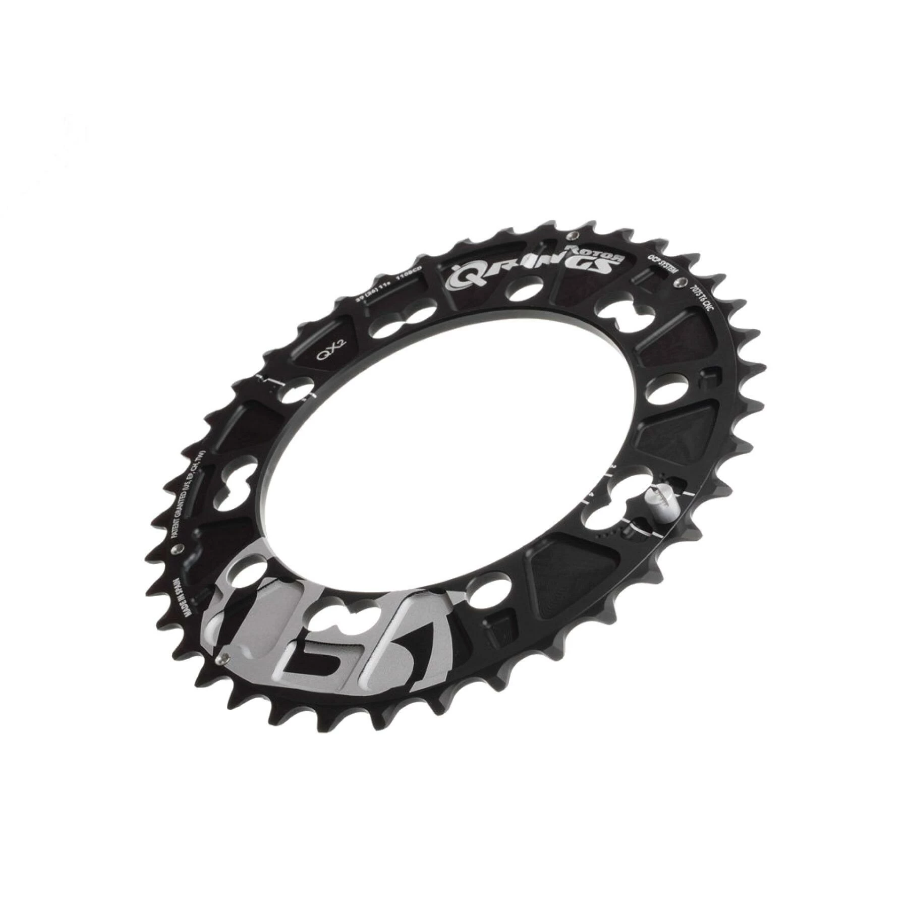 Le Rotor Q Rings est un plateau ovale pour pédalier Rotor double d’entraxe 110mm et compatible avec les pédaliers et . Les Q-Rings réduisent l’effet préjudiciable du point mort grâce à leur forme ovale. Pourquoi utiliser des plateaux ronds alors que la force que l’on est capable d’appliquer sur un cycle de pédalage n’est pas constante ? Lorsque le point mort arrive, la couronne est alors sur son plus petit diamètre permettant ainsi de le passer plus facilement, plus rapidement et avec plus de souplesse. Dès que l’on dépasse le point mort dans le cycle de pédalage, le diamètre du Q-Ring augmente progressivement, jusqu’à présenter le plus gros développement au moment où vos muscles peuvent délivrer leur maximum de puissance.